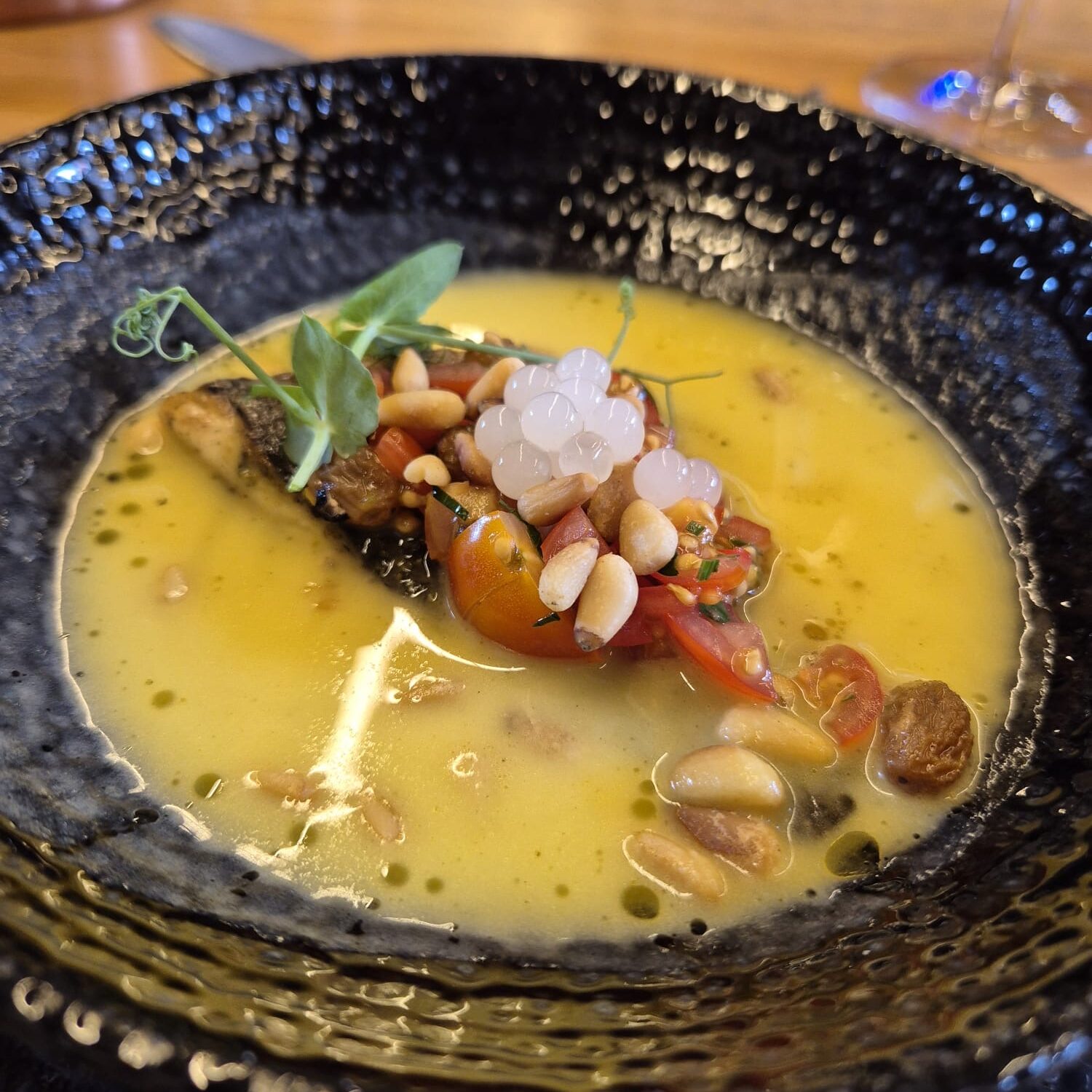 Mediterrane Passion vereint kraftvolle Aromen und feine Eleganz: Argentinische Rotseegarnelen-Spieße, Dorade Royal und Bavarie-Entenbrust eröffnen das Menü. Ein exklusives Iberico-Tasting mit Presa, Pluma, Lagrima und kurzgebratenem Iberico-Bäckchen zeigt die Vielfalt